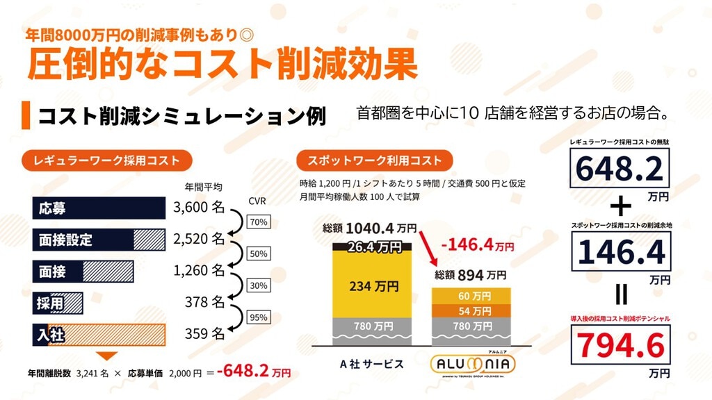 アルムニアを活用した場合の採用コスト削減効果を、たった30秒の入力で簡単にシミュレーションできます。