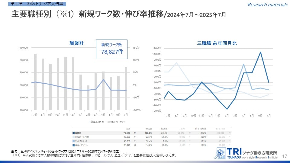 2025年7月度の新規ワーク数は78,827件で、前年同月比は21.2%減となり、3か月連続で前年同月を下回る結果となりました。主要3職種のうち、運送・ドライバーが前年同月比10.5%増と唯一伸長しました。