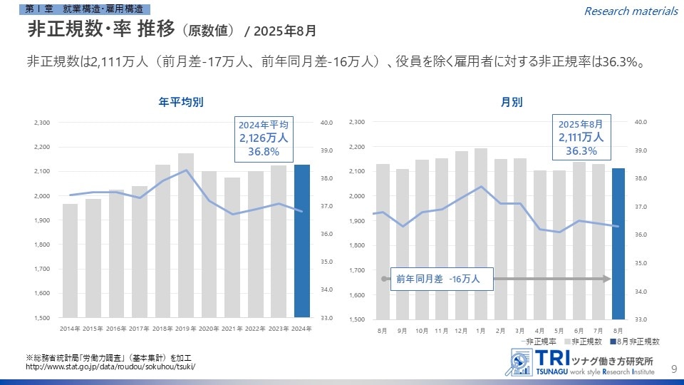 非正規数は2,111万人(前月差-17万人、 前年同月差-16万人)、役員を除く雇用者に対する非正規率は36.3%。