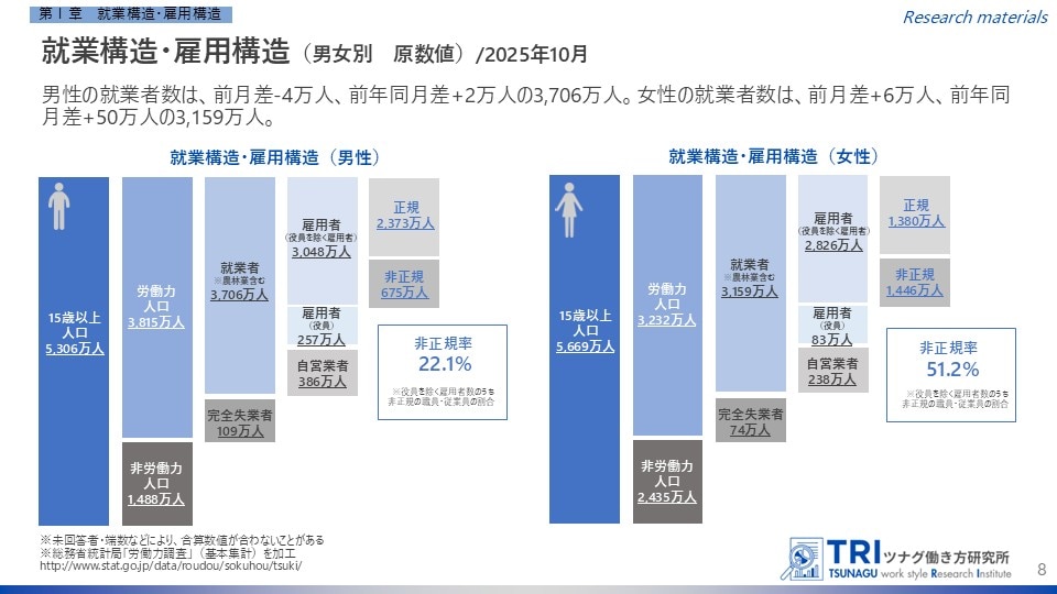 P8:就業構造・雇用構造(男女別 原数値)