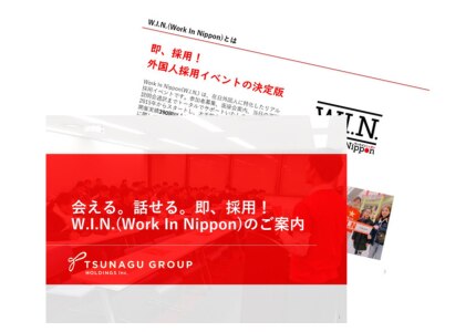 「W.I.N.(Work In Nippon)」は、在日外国人に特化した採用イベントサービスです。2015年からスタートし、開催実績は390回以上、満足度95%の高評価。参加者募集から面接会運営、通訳までトータルサポートし、その場で内定出しが可能なスピード採用を実現します。