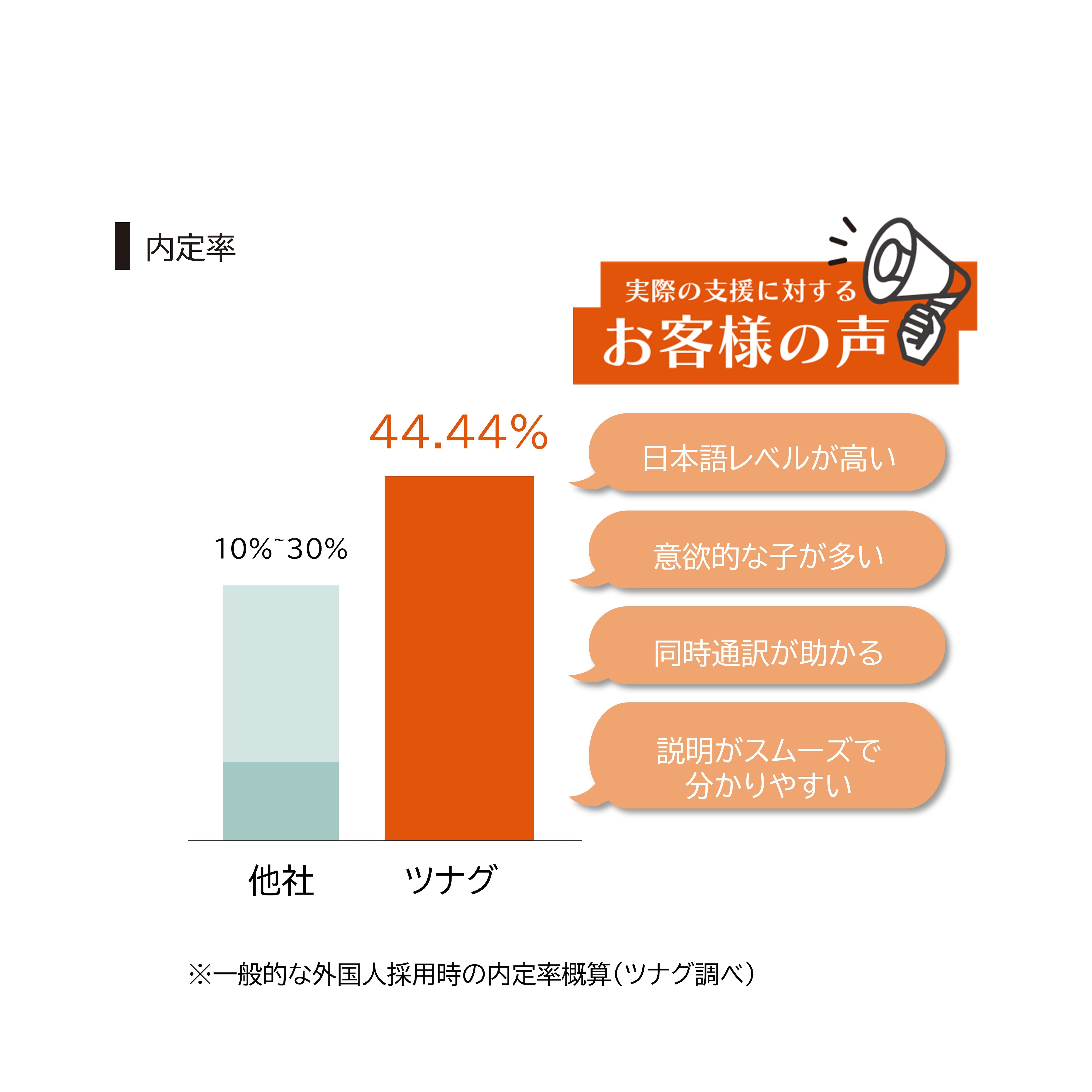03 | 内定・雇用手続き見事内定承諾となりましたら、内定者をお繋ぎいたします。 在留資格や各種手続きを、提携パートナーと連携して代行も可能です。 |