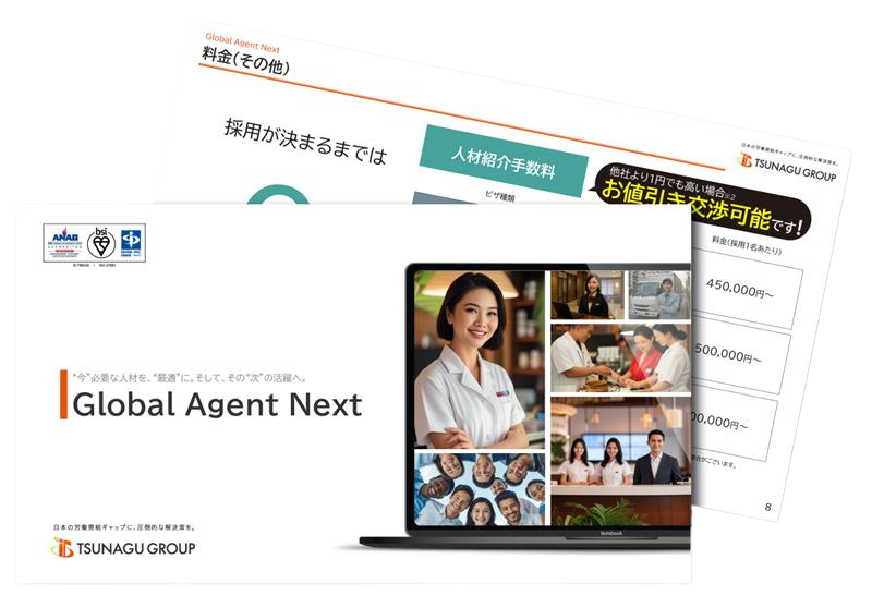 人材紹介費用に加え、在留資格申請(行政書士連携)、受入れ・定着支援までを月額定額で包括。採用人数に応じて変動するコストを抑え、予算化しやすいオールインワンモデルを実現します。