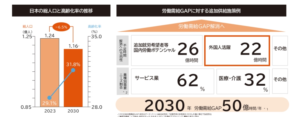 2030年、日本の労働需給GAPは50億時間/年に至ると予想されています。